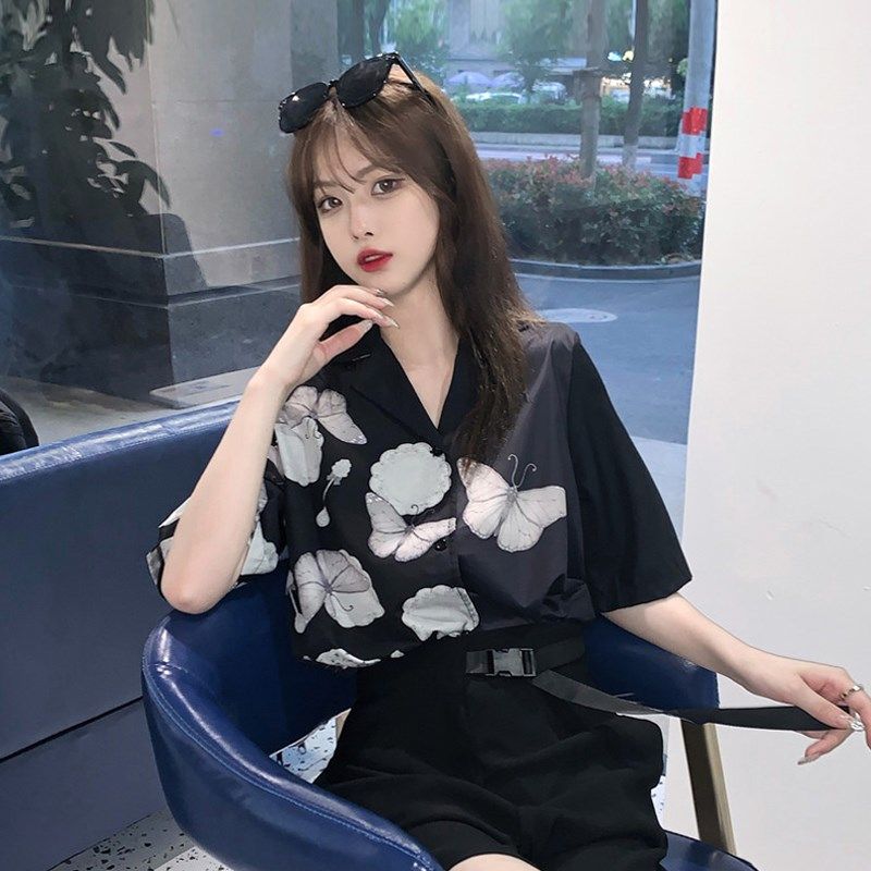 夏季2021新款韩版复古港味蝴蝶薄款衬衫女设计感小众百搭短袖上衣热门设计联盟服务商