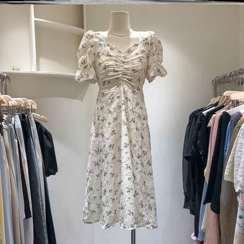2021春夏装设计感v领褶皱泡泡短袖绿色碎花A字裙收腰气质连衣裙子热门设计联盟服务商