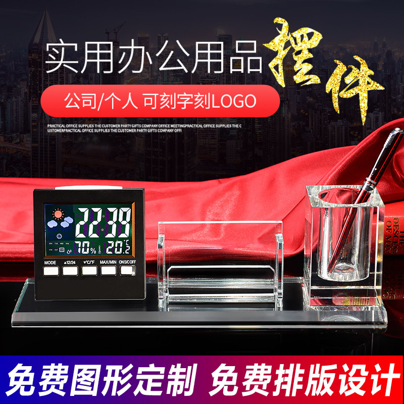水晶笔筒个性定制 商务办公桌摆件多功能电子万年历公司LOGO定制热门设计联盟服务商
