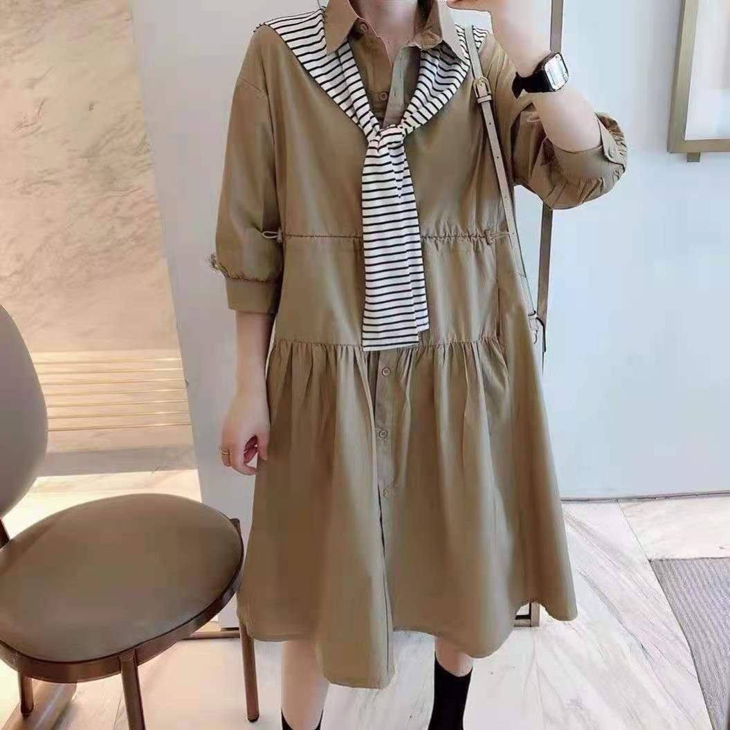 条纹披肩衬衫裙女设计感小众夏2021新款过膝宽松休闲褶皱连衣裙潮热门设计联盟服务商