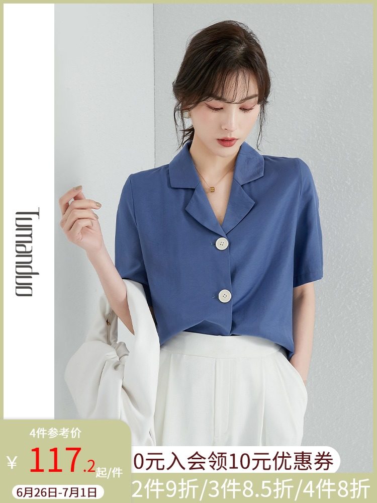 蓝色短袖衬衫女设计感小众衬衣新款2021年夏薄款港风V领法式上衣热门设计联盟服务商