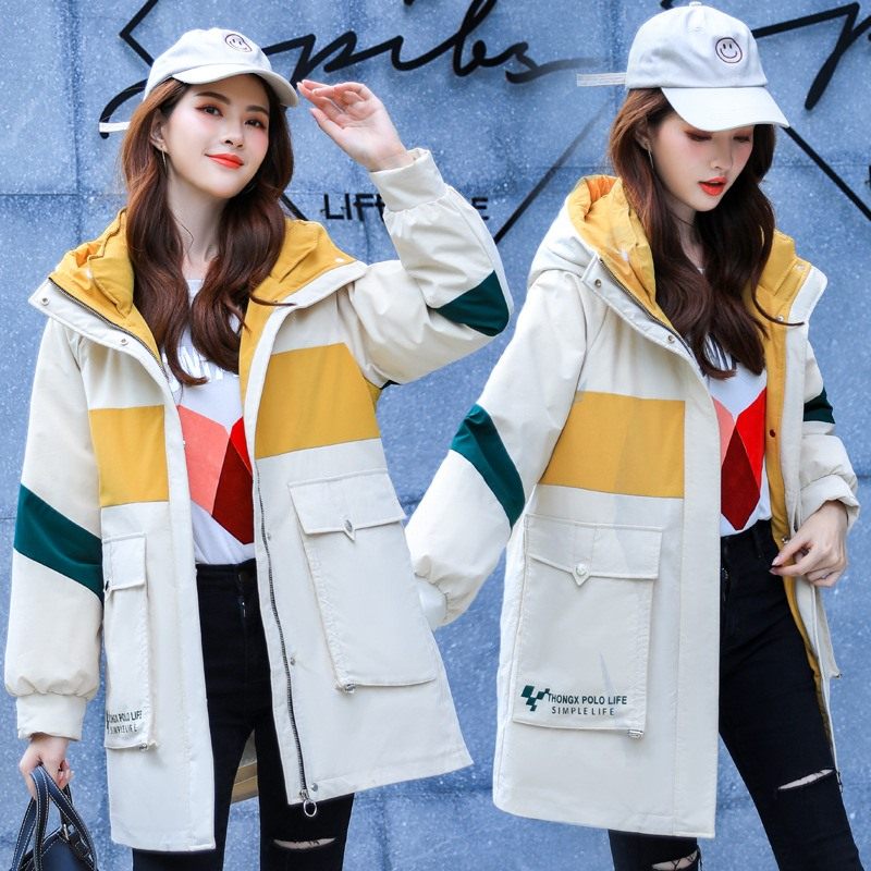 2020冬季韩版大码撞色羽绒棉服女学生中长款加厚连帽工装棉衣外套热门设计联盟服务商