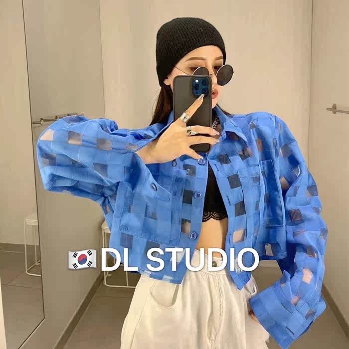 翻领衬衫女港味ins格纹透视薄款设计感上衣长袖显瘦短款防晒开衫热门设计联盟服务商